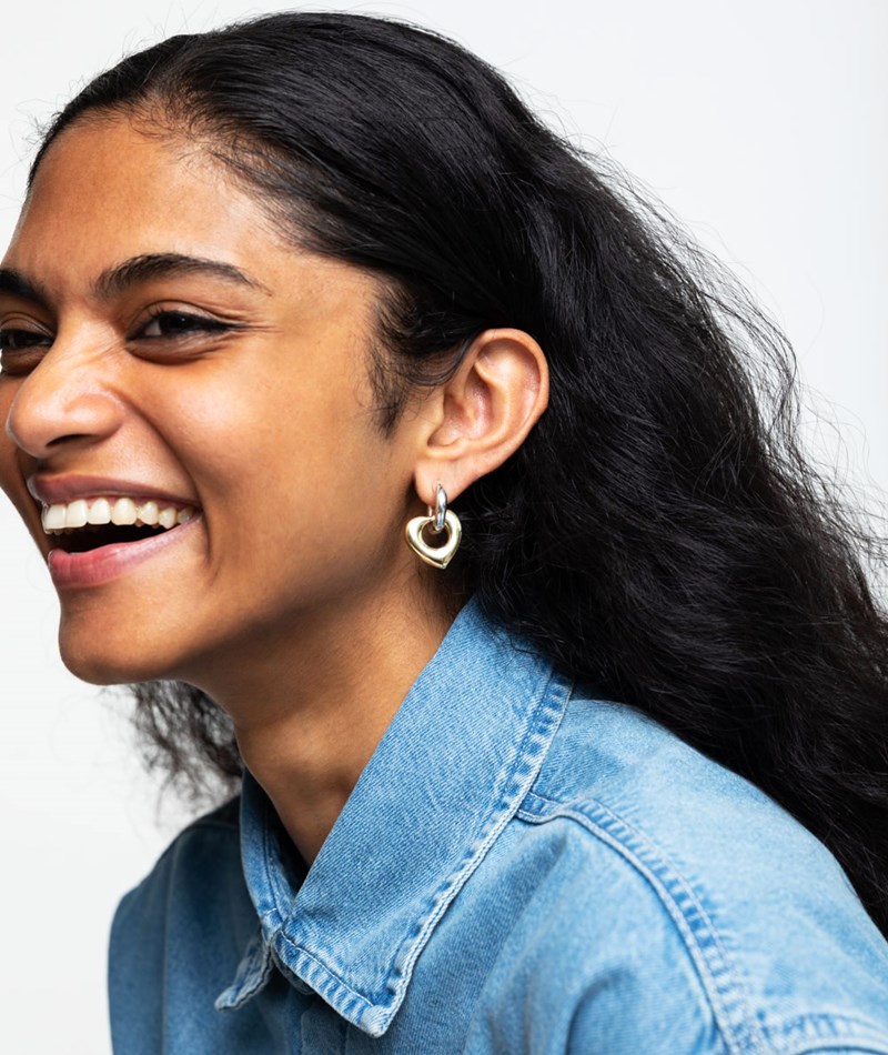 • Kleine silberne Creolen mit breitem Herzanhänger in Gold