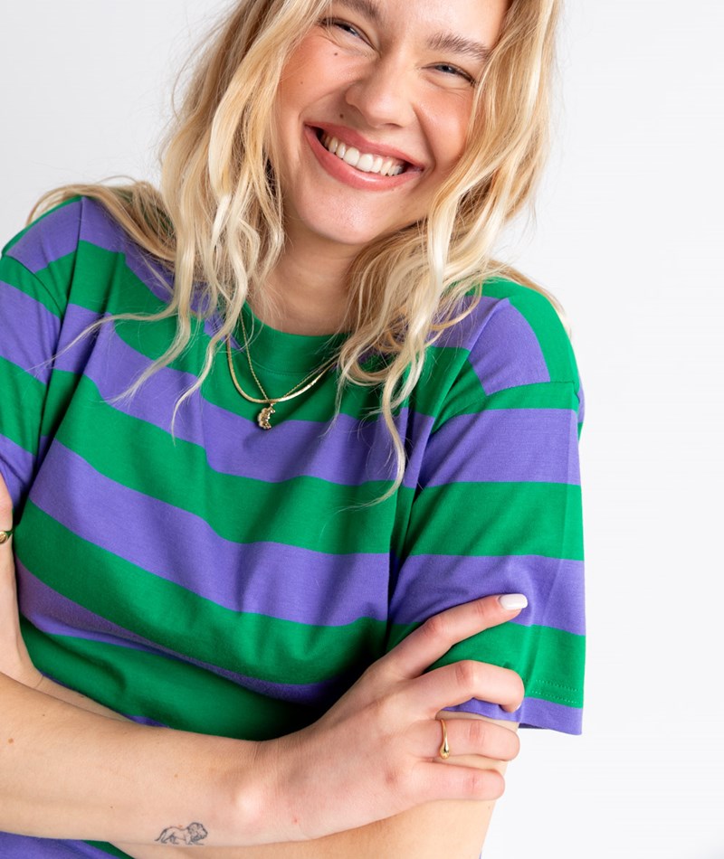 • Mit breiten Streifen in Grün und Lila
