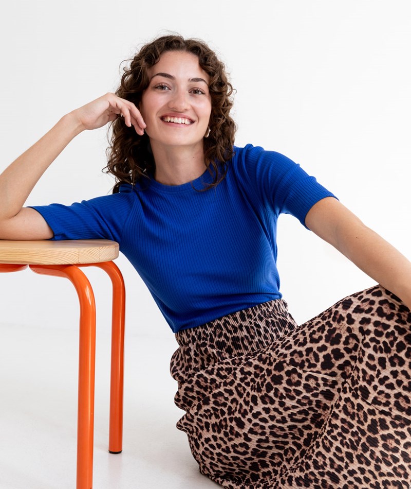 Dank des elastischen Materials passt sich das T-Shirt in Royalblau perfekt an die Körperform an und bietet gleichzeitig Bewegungsfreiheit. Das gerippte Design sorgt für eine moderne und strukturierte Optik, während die kräftige Farbe jedem Outfit einen frischen Akzent verleiht. Kombiniere es mit Jeans, Röcken oder Layer-Looks für vielseitige Styles, die du jeden Tag tragen kannst.
