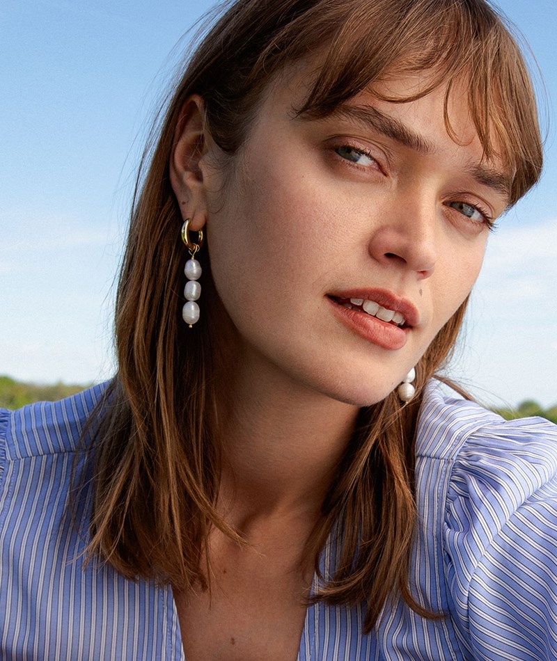 • Mit drei hängenden, weißen Perlen