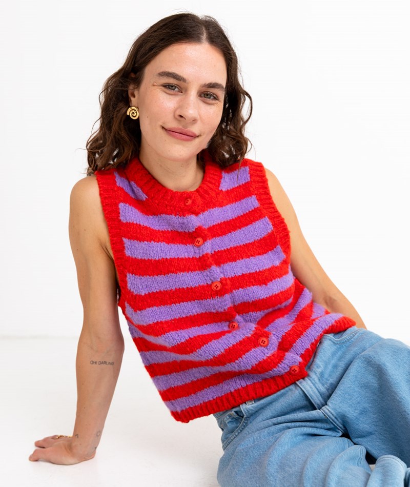 • Weiche Strickweste mit knalligem Streifenmuster in Rot und Lila