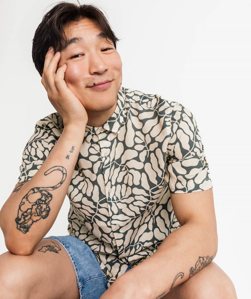 • Kurzärmliges Hemd in Beige und Dunkelgrün